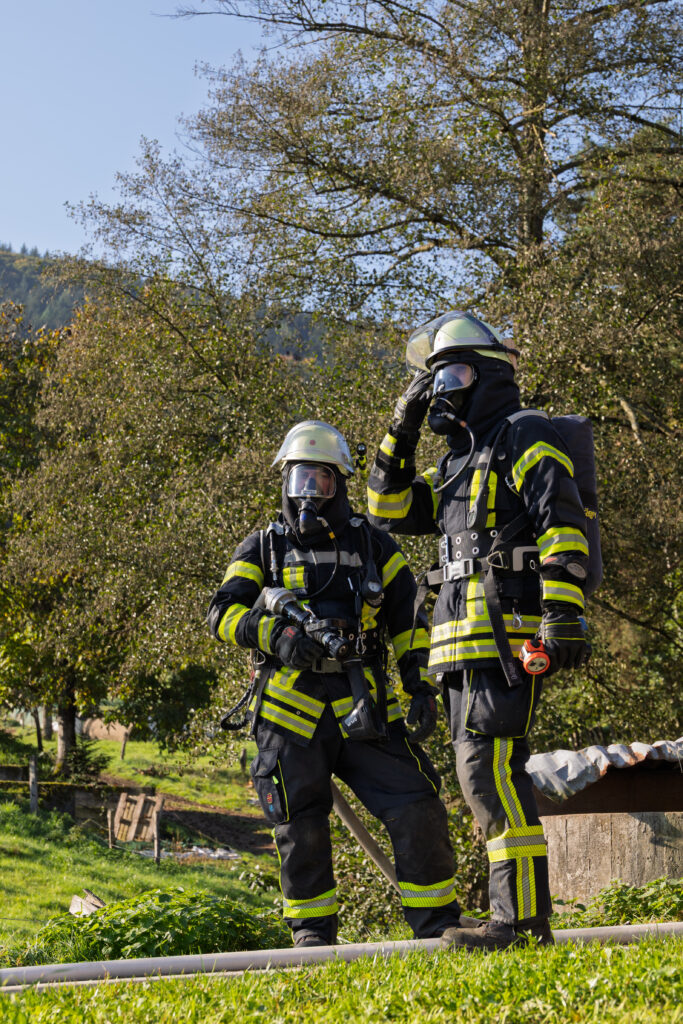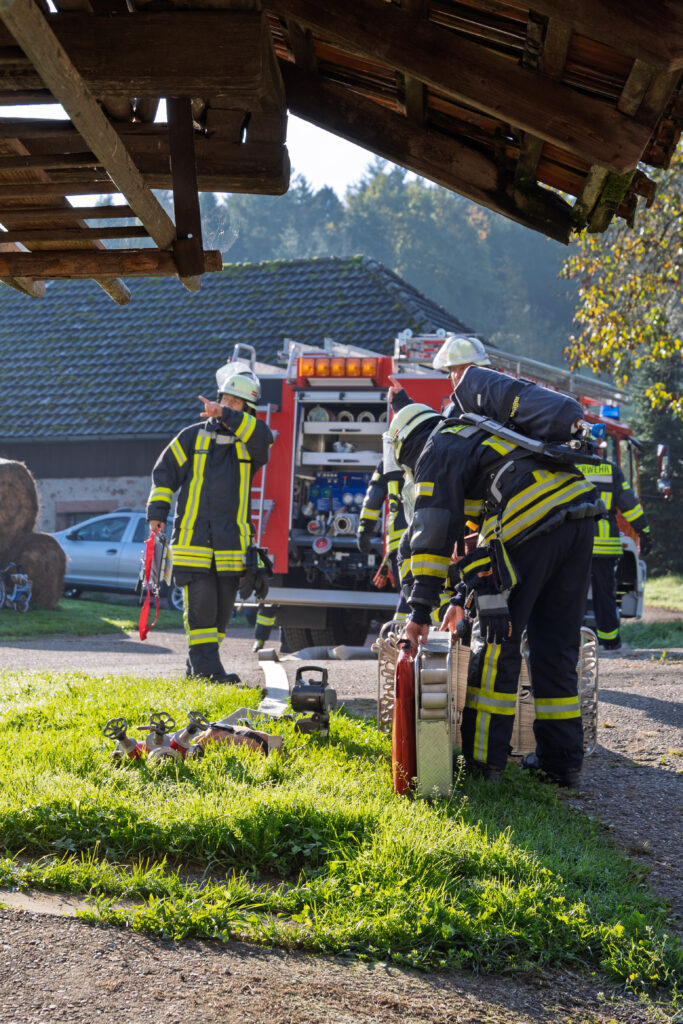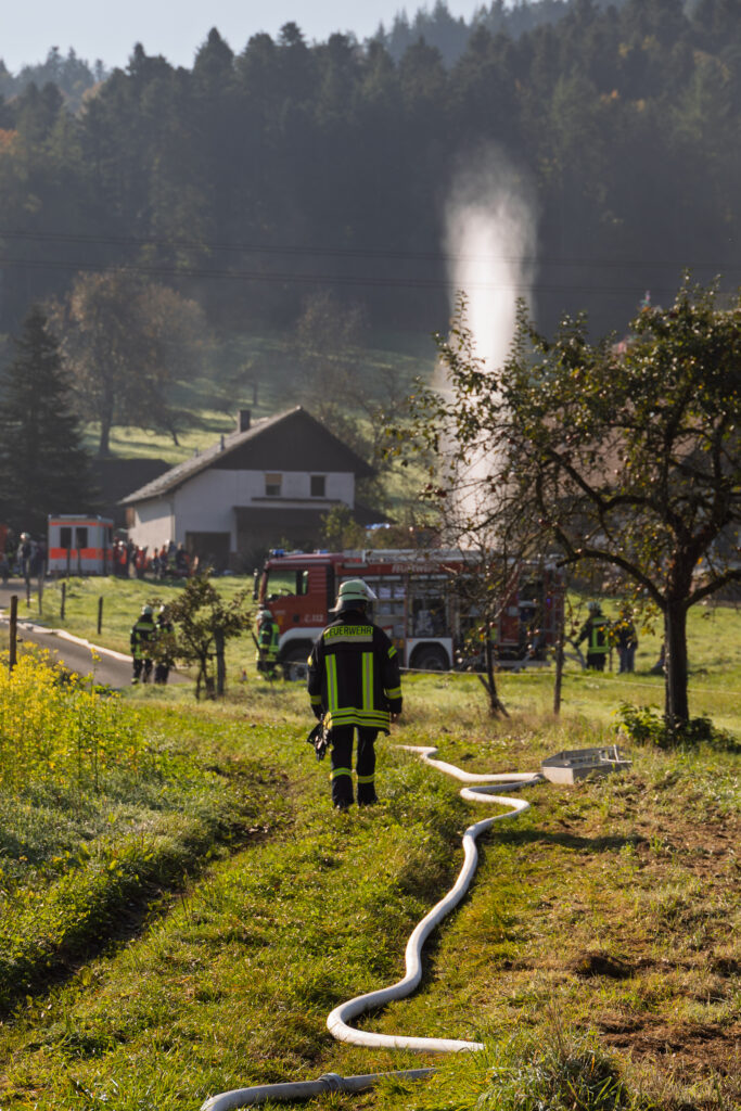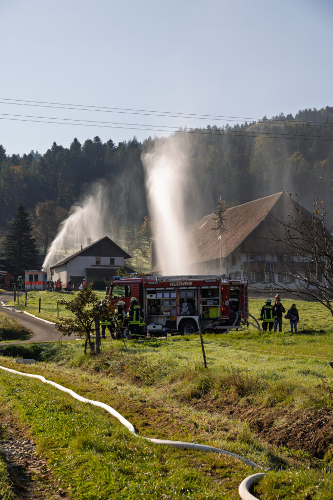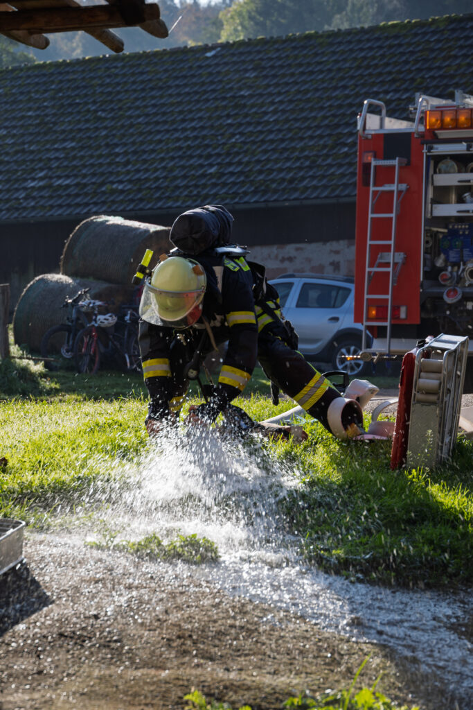 Unsere Jugendfeuerwehr übernahm dabei die Rolle der Verletzten und Eingeschlossenen – und sorgte so für ein besonders lebensechtes Übungsbild. Unter Atemschutz und mit Wärmebildkamera suchten die Einsatzkräfte in stark verrauchten Räumen nach den Vermissten. Eine besondere Herausforderung stellte die Wasserversorgung dar, da sich der nächste Hydrant mehrere Hundert Meter entfernt befindet. Zusätzlich wurde daher Wasser aus dem Litschentalbach entnommen.
