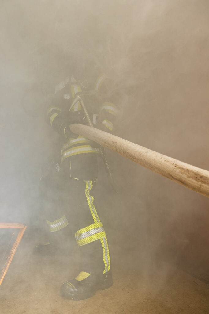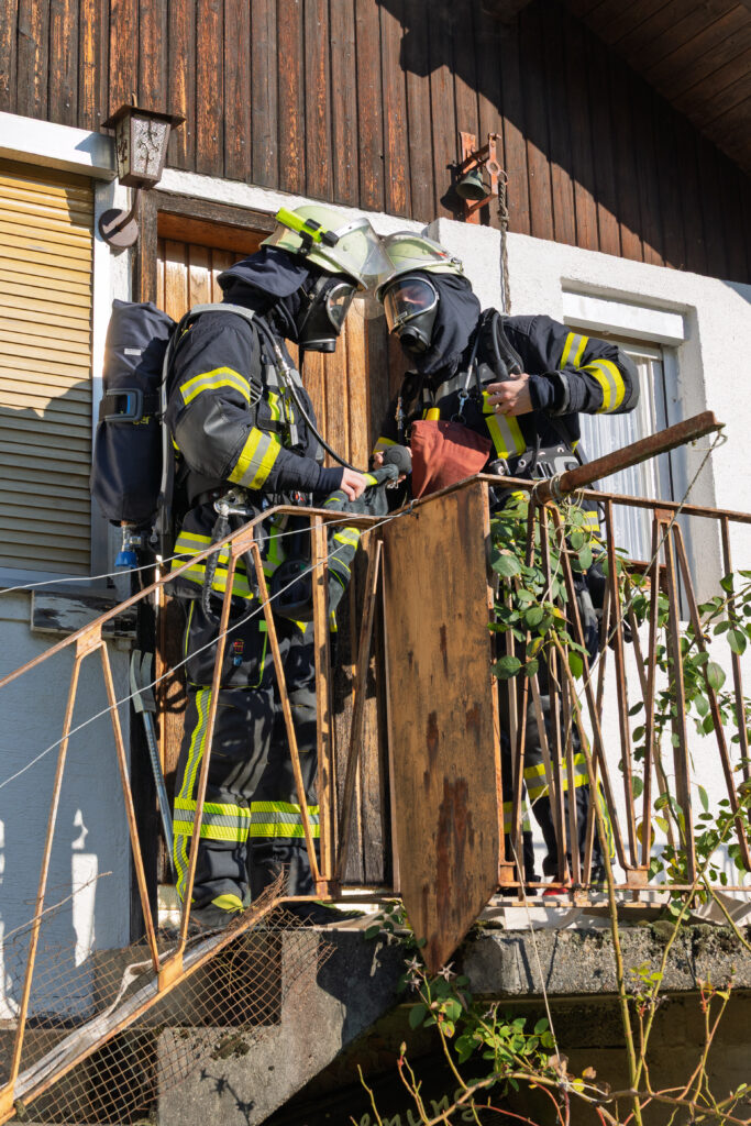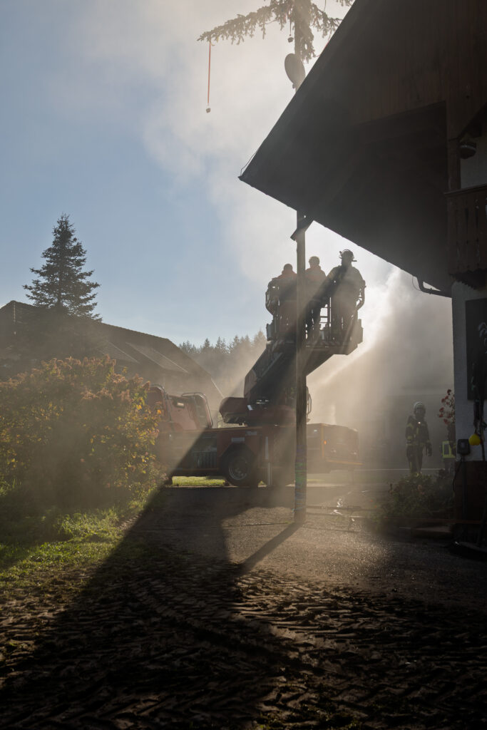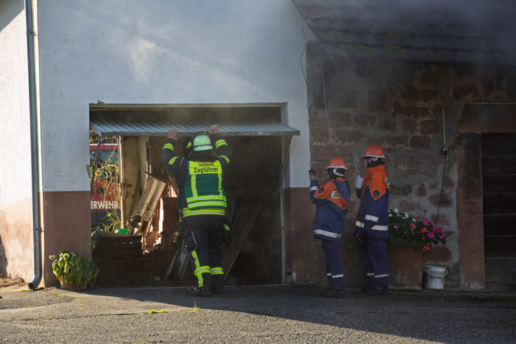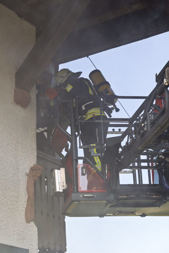 Unsere Jugendfeuerwehr übernahm dabei die Rolle der Verletzten und Eingeschlossenen – und sorgte so für ein besonders lebensechtes Übungsbild. Unter Atemschutz und mit Wärmebildkamera suchten die Einsatzkräfte in stark verrauchten Räumen nach den Vermissten. Eine besondere Herausforderung stellte die Wasserversorgung dar, da sich der nächste Hydrant mehrere Hundert Meter entfernt befindet. Zusätzlich wurde daher Wasser aus dem Litschentalbach entnommen.